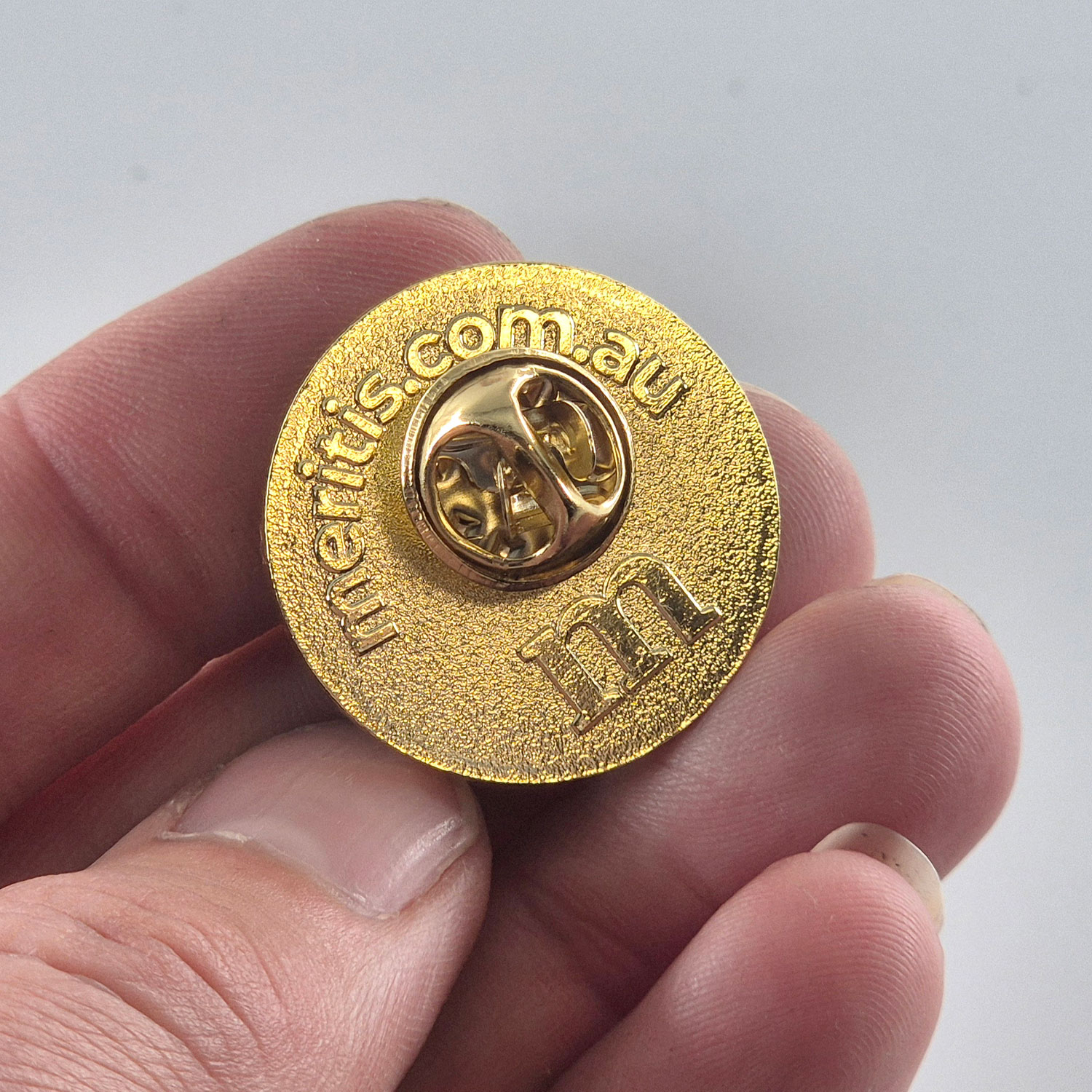 25mm metal pin with raised design in commemorative packaging.